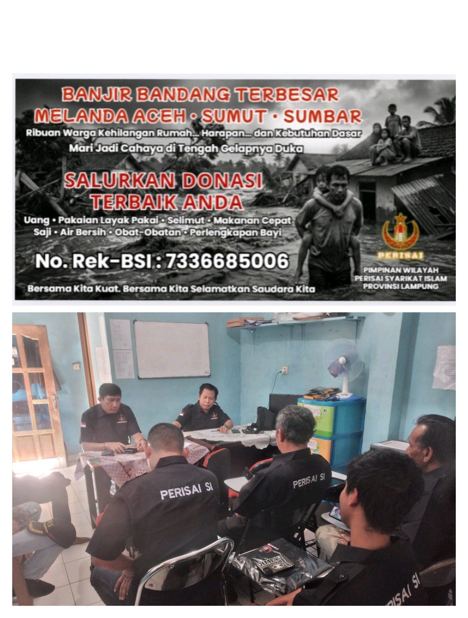 Pimpinan Wilayah (PW) Perisai Serikat Islam (SI) Provinsi Lampung menggelar aksi kemanusiaan berupa penggalangan donasi bagi korban bencana alam yang terjadi di wilayah Sumatera. Kegiatan tersebut berlangsung di Sekretariat PW Perisai SI Lampung, Telukbetung Utara Kota Bandarlampung, pada Sabtu (06/11/2025).