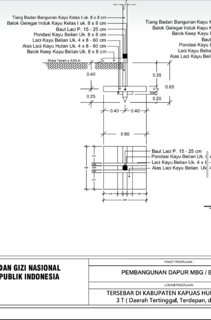 Berdasarkan dokumen teknis yang diperoleh redaksi, bangunan Dapur MBG tersebut dirancang menggunakan pondasi kayu belian, balok pengikat, serta tiang badan bangunan dengan ukuran tertentu yang dinilai relatif kecil untuk sebuah fasilitas layanan publik. Desain ini kemudian memunculkan pertanyaan terkait kesesuaian standar bangunan negara, mengingat Dapur MBG direncanakan sebagai fasilitas operasional jangka panjang dalam mendukung program pemenuhan gizi masyarakat.