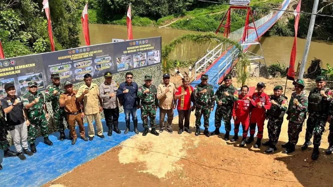 Krimsus86.com – Entikong, Dankolakopsrem 121/Abw Brigjen TNI Purnomosidi, S.I.P., M.A.P., M.Han. meresmikan Jembatan Gantung Sekayam yang berlokasi di Dusun Mangkau, Desa Palapasang, Kecamatan Entikong, wilayah perbatasan RI–Malaysia, pada Sabtu (13/12/2025).