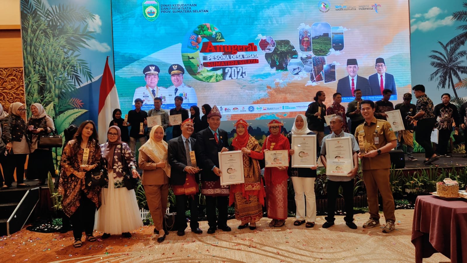 Krimsus86.com Palembang – Kamis 18 November 2025,Acara Anugrah Pesona Desa Wisata (APDW) Sumatera Selatan 2025 yang digelar oleh Pemerintah Provinsi Sumatera Selatan berlangsung meriah di Ballroom Hotel Arya Duta, Palembang. Pada ajang bergengsi tersebut, Desa Sumber Rahayu, Kecamatan Rambang, Kabupaten Muara Enim berhasil meraih Juara III Tingkat Provinsi untuk Kategori Desa Suvenir Wisata Terbaik.