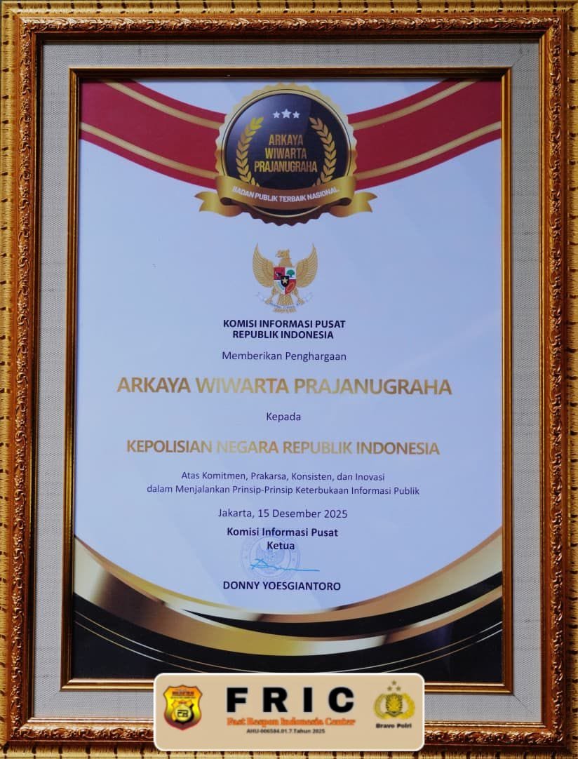 Penghargaan Arkana Wiwarta Prajanugraha dalam Anugerah KIP 2025 ini menjadi tonggak penting bagi Polri, sekaligus menegaskan posisinya sebagai Badan Publik Terbaik Nasional dalam pelaksanaan keterbukaan informasi publik di Indonesia.(J.Hardi Humed DPP FRIC)