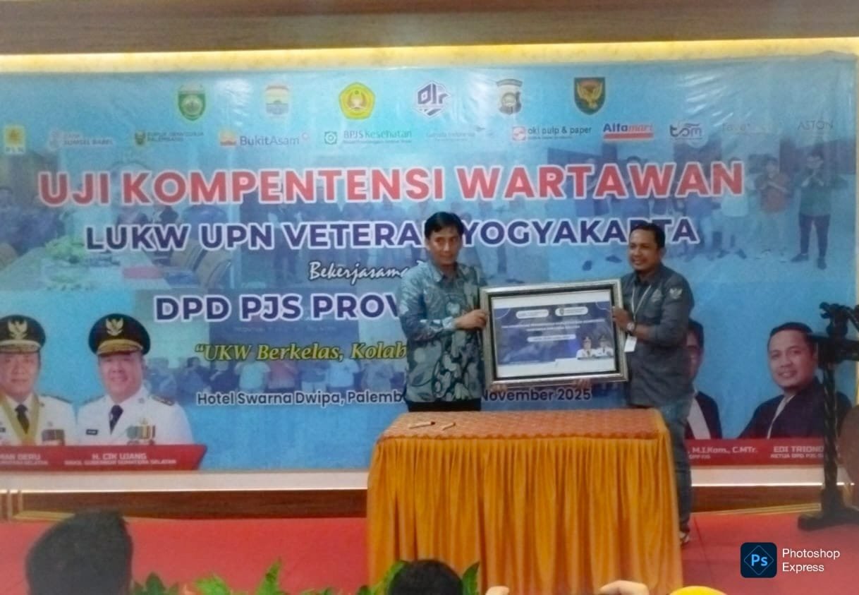Krimsus86.com Palembang —28-November-25 Kompetensi jurnalis kembali mendapat perhatian serius di Sumatera Selatan. Melalui kerja sama antara Lembaga Uji UKW UPN “Veteran” Yogyakarta dan Dewan Pimpinan Daerah Pro Jurnalis Media Siber (PJS) Sumatera Selatan, Uji Kompetensi Wartawan (UKW) resmi digelar di hotel swarnadwipa Palembang, Jumat (28/11/2025)