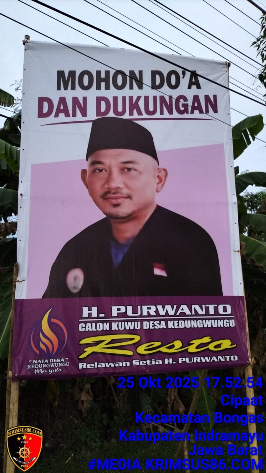Krimsus86.com – Indramayu, Rabu, 25 Oktober 2025 –Dengan diiringi oleh ratusan warga simpatisan dan Relawan Setia H. Purwanto (RESTO), H. Purwanto atau yang akrab disapa H. Ipung, secara resmi mendaftarkan diri sebagai Bakal Calon Kuwu Desa Kedungwungu, Kecamatan Anjatan, Kabupaten Indramayu. Pendaftaran ini merupakan bagian dari tahapan Pemilihan Kuwu Serentak Kabupaten Indramayu yang akan digelar pada Rabu, 10 Desember 2025 mendatang.