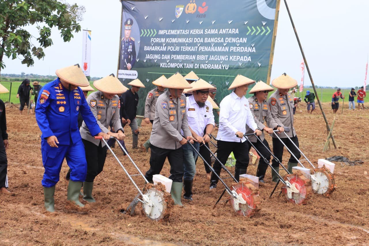 Baharkam Polri bersama Forum Komunikasi Doa Bangsa (FKDB) melaksanakan penanaman perdana jagung dan penyerahan bibit kepada kelompok tani di Kabupaten Indramayu, Kamis (11/12/2025).