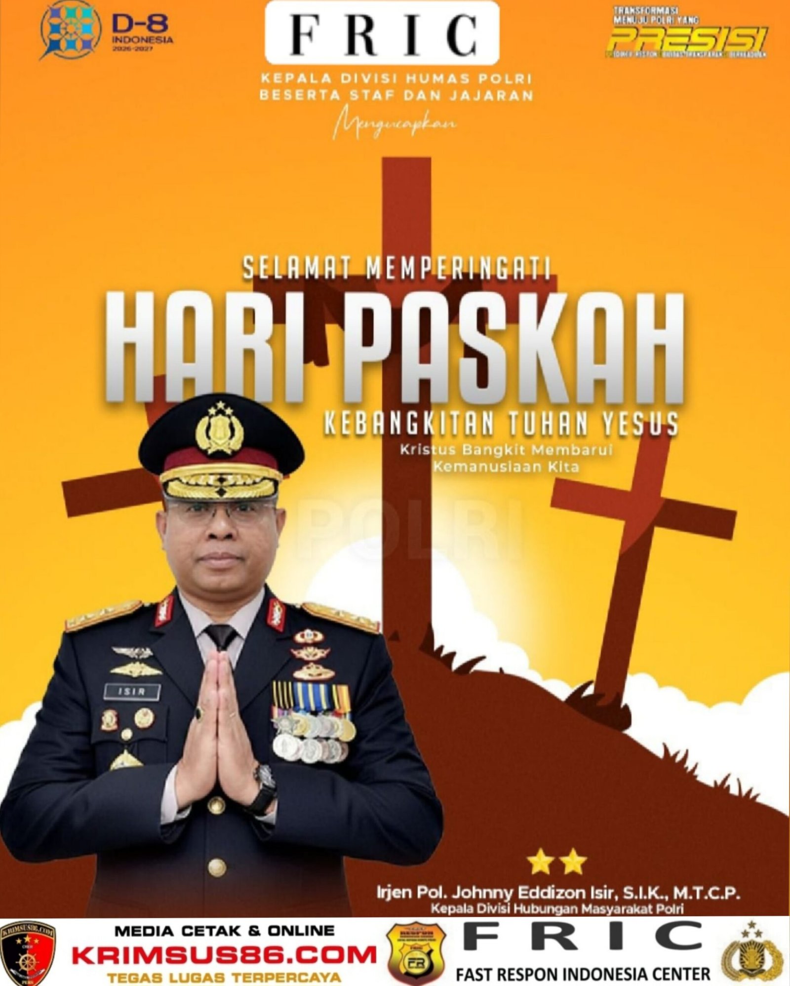 Krimsus86.com Jakarta, 2026 — Kepala Divisi Humas Kepolisian Negara Republik Indonesia, Johnny Eddizon Isir, menyampaikan ucapan Selamat Memperingati Hari Paskah kepada seluruh umat Kristiani di Indonesia yang merayakan.