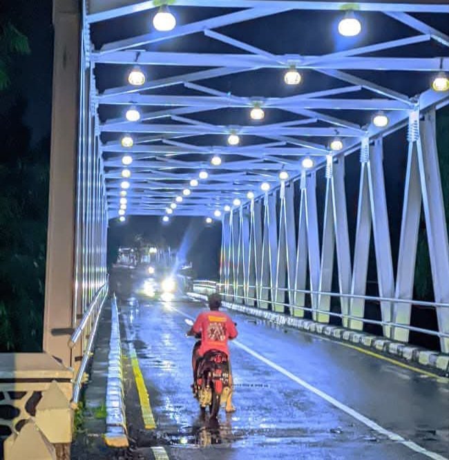 Rabu ,31 – Desember -2025 Krimsus86.com -Indramayu Jawabarat – Penampakan Jembatan Cikamurang Desa Cikawung Kecamatan Terisi (Jalur Desa Cikawung – Sumedang). Sekarang jembatane diberi lampu, jadi terang benerang Jembatan Cikawung adalah yang terletak di indramayu barat 0 Kilometer Indramayu Barat punya wajah baru.yang punya penerangan di atas jembatan kali Cikamurang Indramayu Barat disorot lampu putih led.