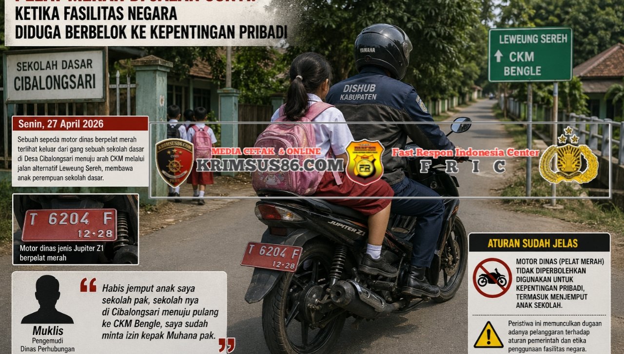 Sebuah sepeda motor dinas berpelat merah, jenis Jupiter Z1 dengan nomor polisi T 6204 F, terlihat melaju perlahan keluar dari sebuah gang sekolah dasar. Kendaraan itu bukan sekadar melintas. Di atasnya, seorang anak perempuan berseragam sekolah duduk dibonceng, seolah aktivitas tersebut adalah rutinitas biasa. Namun, yang menjadi sorotan bukanlah perjalanan itu sendiri, melainkan status kendaraan yang digunakan—fasilitas negara yang seharusnya steril dari kepentingan pribadi.