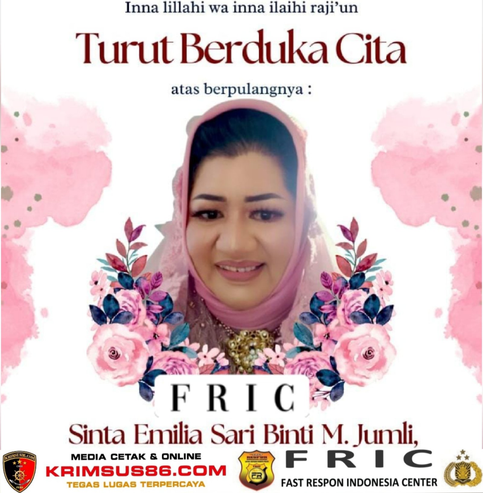 “Kami keluarga besar FRIC Fast Respon Indonesia Center turut berduka cita yang sedalam-dalamnya atas wafatnya almarhumah Sinta Emilia Sari Binti M. Jumli, istri dari Sdr. Budi Utomo, wartawan sekaligus Pimpinan Redaksi media detiknasionalnews. Semoga Allah SWT menerima seluruh amal ibadah almarhumah, mengampuni segala khilafnya, melapangkan kuburnya, serta menempatkannya di tempat terbaik di sisi-Nya,” ujar H. Dian Surahman.