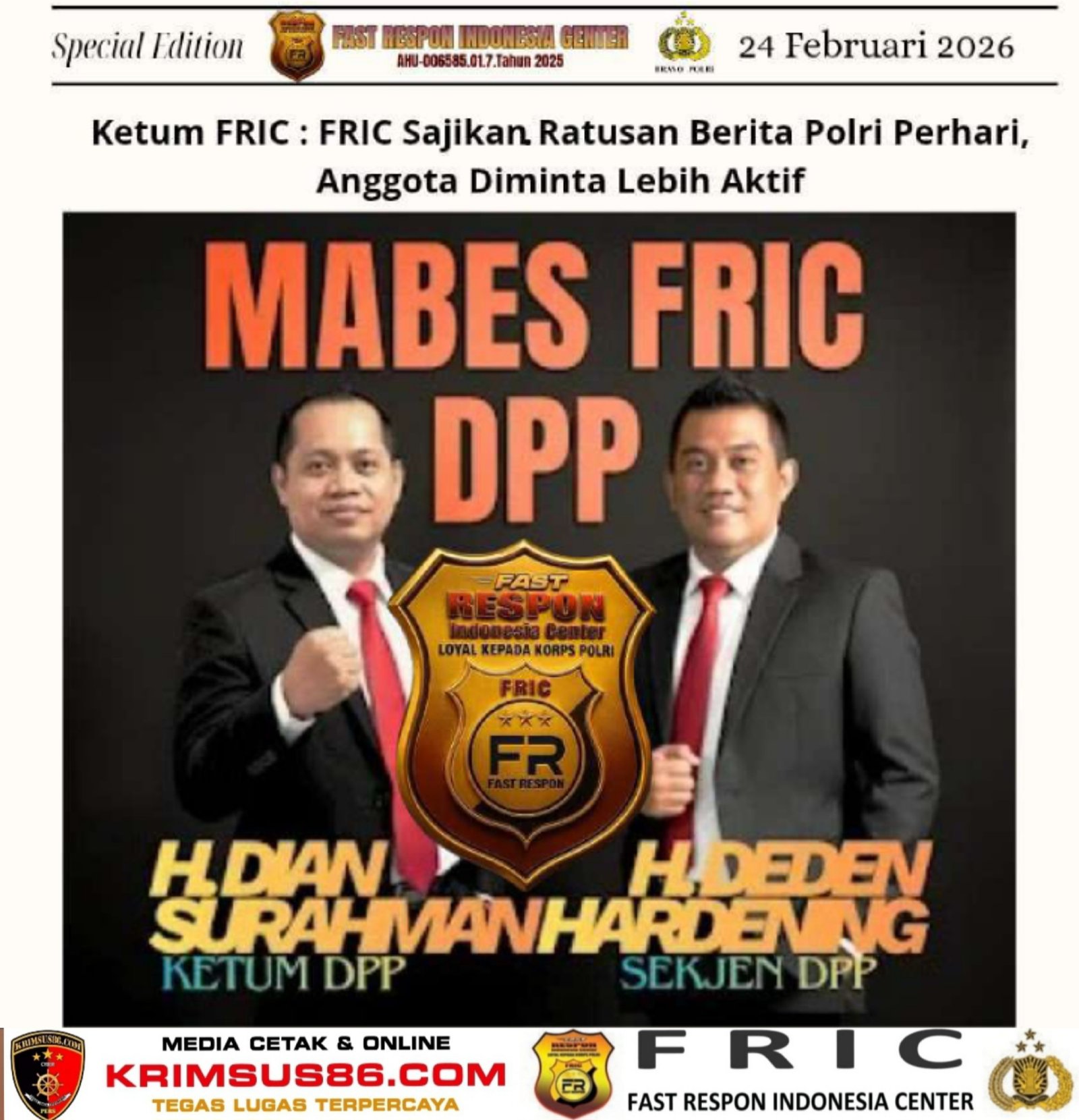 Krimsus86.com, Jakarta, 24 Februari 2025 – Ketua Umum Fast Respon Indonesia Center (FRIC), H. Dian Surahman, menegaskan bahwa FRIC setiap hari menyajikan ratusan pemberitaan terkait kinerja Polri di seluruh Indonesia sebagai bentuk dukungan terhadap Presiden dan Kapolri.