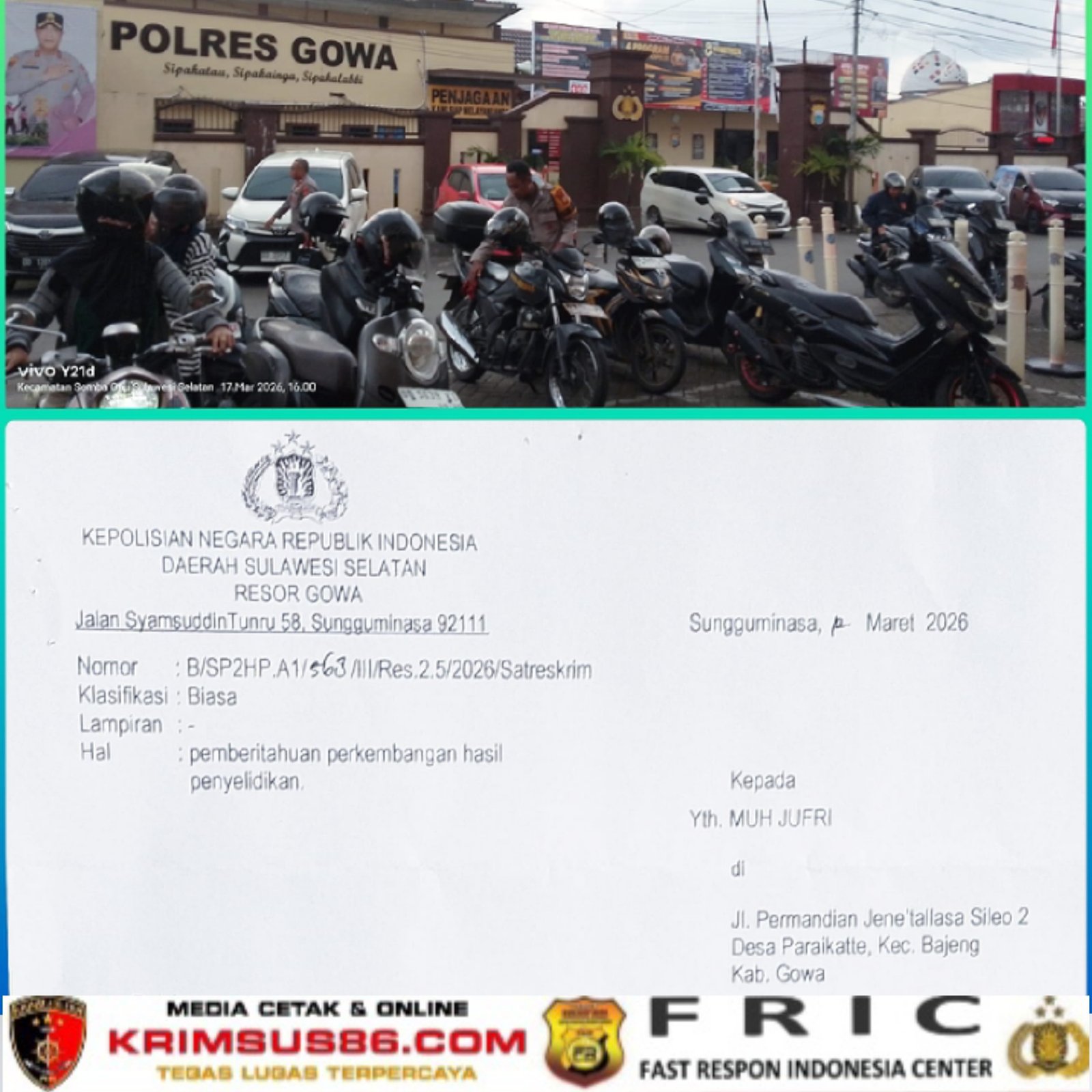 Surat pemberitahuan tersebut bernomor B/SP2HP.A1/568/III/Res.2.5/2026/Satreskrim, yang berisi informasi mengenai progres penyelidikan perkara yang dilaporkan sebelumnya oleh korban. Kedatangan (J) ke Mapolres Gowa bertujuan untuk mengetahui secara langsung sejauh mana langkah-langkah yang telah dilakukan aparat kepolisian dalam mengungkap kasus penipuan berbasis daring yang dialaminya.