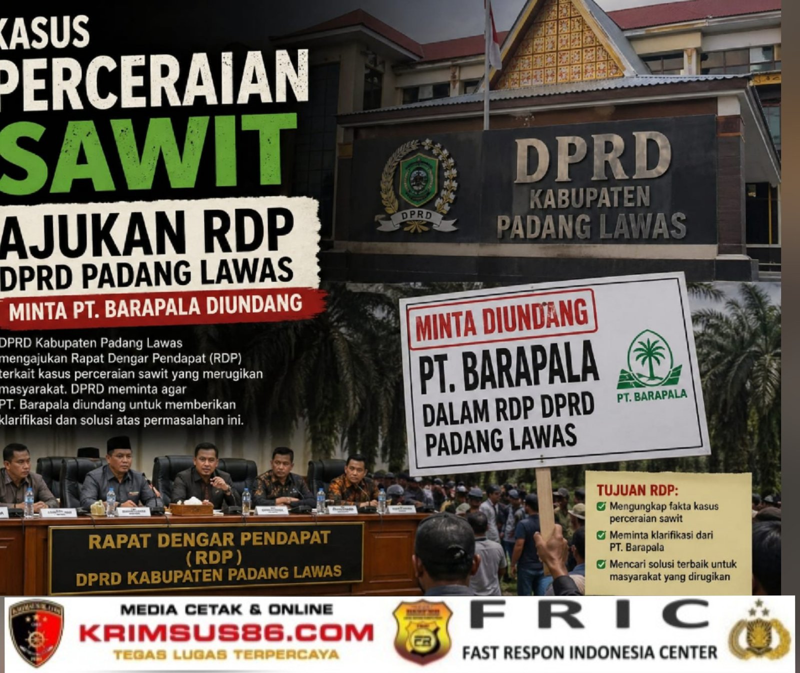 Krimsus86.com Padang Lawas, 27 April 2026 – Tim Advokat Bintang Keadilan secara resmi melayangkan surat permohonan Rapat Dengar Pendapat (RDP) kepada Dewan Perwakilan Rakyat Daerah Kabupaten Padang Lawas pada Senin (27/4/2026). Permohonan ini diajukan sebagai tindak lanjut atas kasus dugaan pencurian Tandan Buah Segar (TBS) kelapa sawit yang menjerat tiga warga Luhat Unte Rudang.