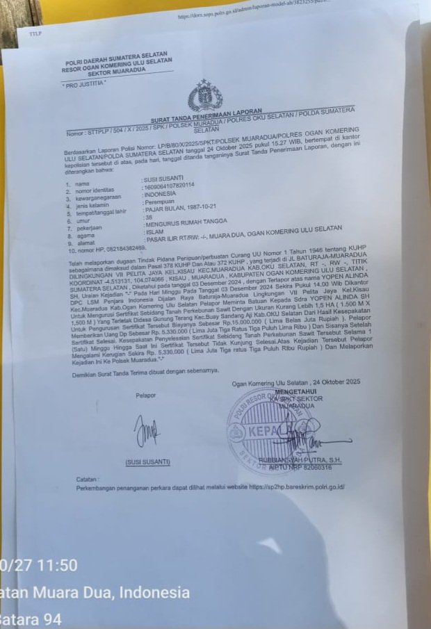 Menanggapi pemberitaan dan laporan polisi dengan Nomor: STTP LP/504/X/2025/SPK/POLSEK MURA DUA/POLRES OKU SELATAN/POLDA SUMATERA SELATAN, yang menyebutkan nama Yoppen Alinda, S.H., selaku pimpinan Kantor Pimpinan Cabang Law Firm Descova Ogan Komering Ulu (OKU), diduga terlibat dalam tindak pidana penipuan sebagaimana dimaksud dalam Pasal 378 KUHP dan/atau Pasal 372 KUHP juncto Undang-Undang Nomor 1 Tahun 1946 tentang KUHP, pihak Law Firm Descova memberikan klarifikasi resmi untuk meluruskan informasi yang beredar di masyarakat.
