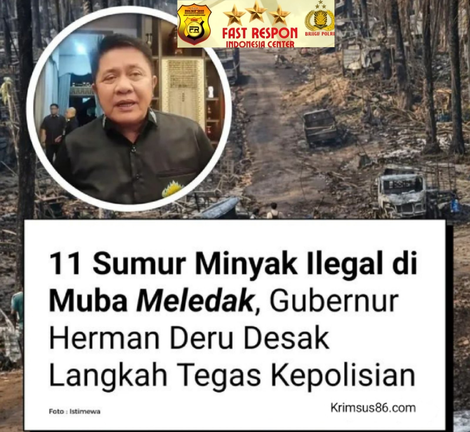Krimsus86.com Palembang, 3 April 2026 — Gubernur Sumatera Selatan, Herman Deru, menyatakan telah menerima laporan resmi dari Bupati Musi Banyuasin terkait insiden ledakan belasan sumur minyak ilegal di Kecamatan Keluang, Kabupaten Musi Banyuasin (Muba).