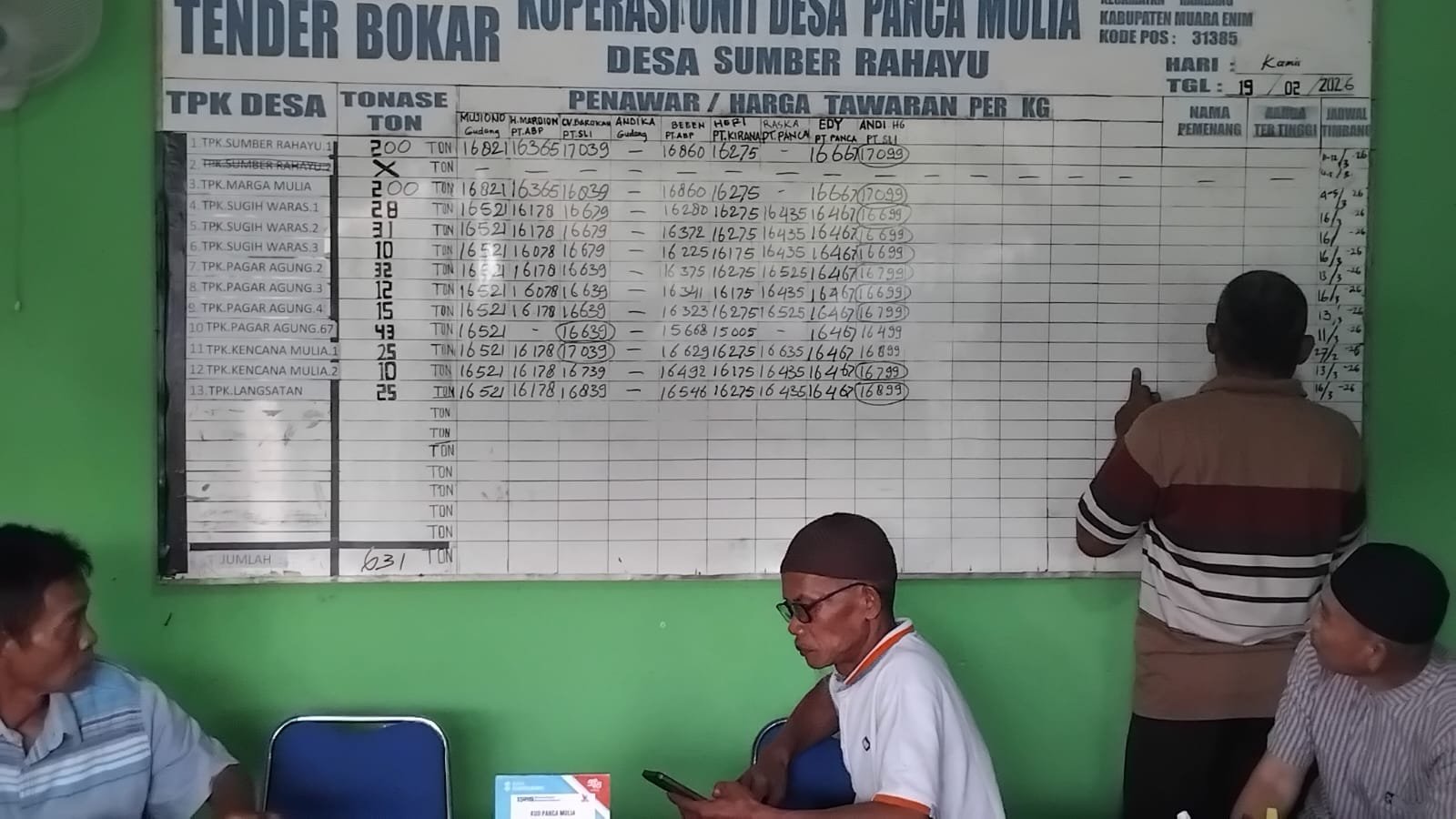 Krimsus86.com, Rambang, 19 Februari 2026 – KUD Panca Mulya Desa Sumber Rahayu, Kecamatan Rambang, Kabupaten Muara Enim, menggelar lelang bokar (bahan olah karet) bulanan dengan total volume mencapai 631 ton. Jumlah tersebut tersebar di 13 Tempat Penampungan Karet (TPK) dan diikuti oleh 7 penawar dari perwakilan gudang serta pabrik pengolahan karet.