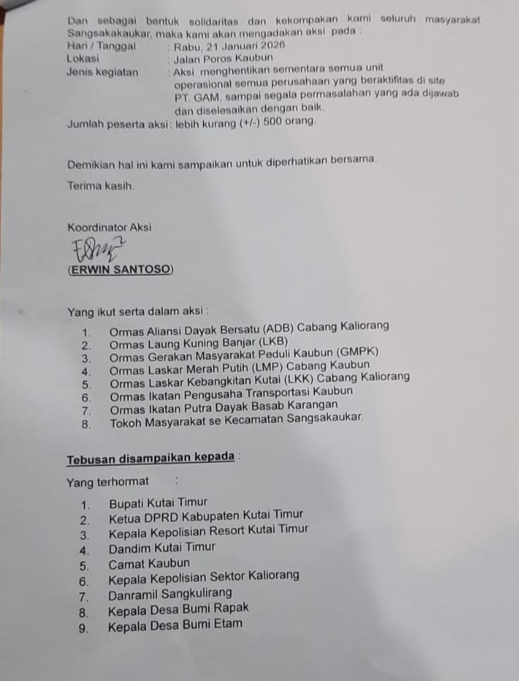 Koordinator aksi, Erwin Santoso, menyampaikan bahwa selama ini masyarakat pribumi dan warga lokal belum mendapatkan porsi yang adil dalam kesempatan kerja di wilayah operasional perusahaan. Menurutnya, masih banyak posisi pekerjaan yang diisi oleh tenaga kerja dari luar Pulau Kalimantan, sementara masyarakat setempat memiliki kemampuan dan kesiapan untuk bekerja.
