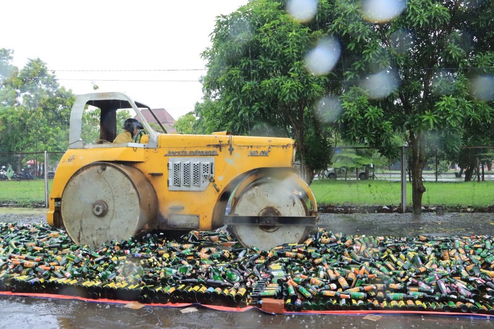 Sebanyak 21.560 botol minuman keras dari berbagai merek dan jenis dimusnahkan dengan cara dilindas menggunakan alat berat. Barang bukti tersebut merupakan hasil razia yang dilaksanakan oleh Polres Indramayu bersama jajaran Polsek di wilayah hukum Polres Indramayu sepanjang tahun 2025.