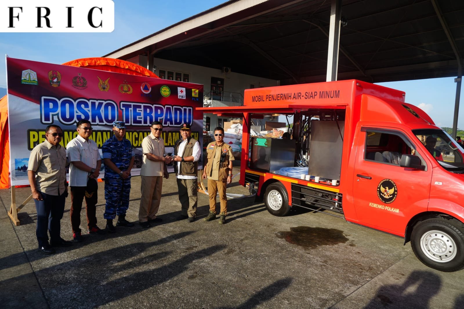 Penyerahan mobil penjernih air digelar di Posko Pendampingan BNPB, Shelter Galaxy Lapangan Udara Sultan Iskandar Muda, Sabtu (13/12/2025). Dalam prosesi penyerahan, Menko Polkam juga meminta mobil penjernih air tersebut dites terlebih dahulu guna memastikan perangkat di dalamnya berfungsi baik.