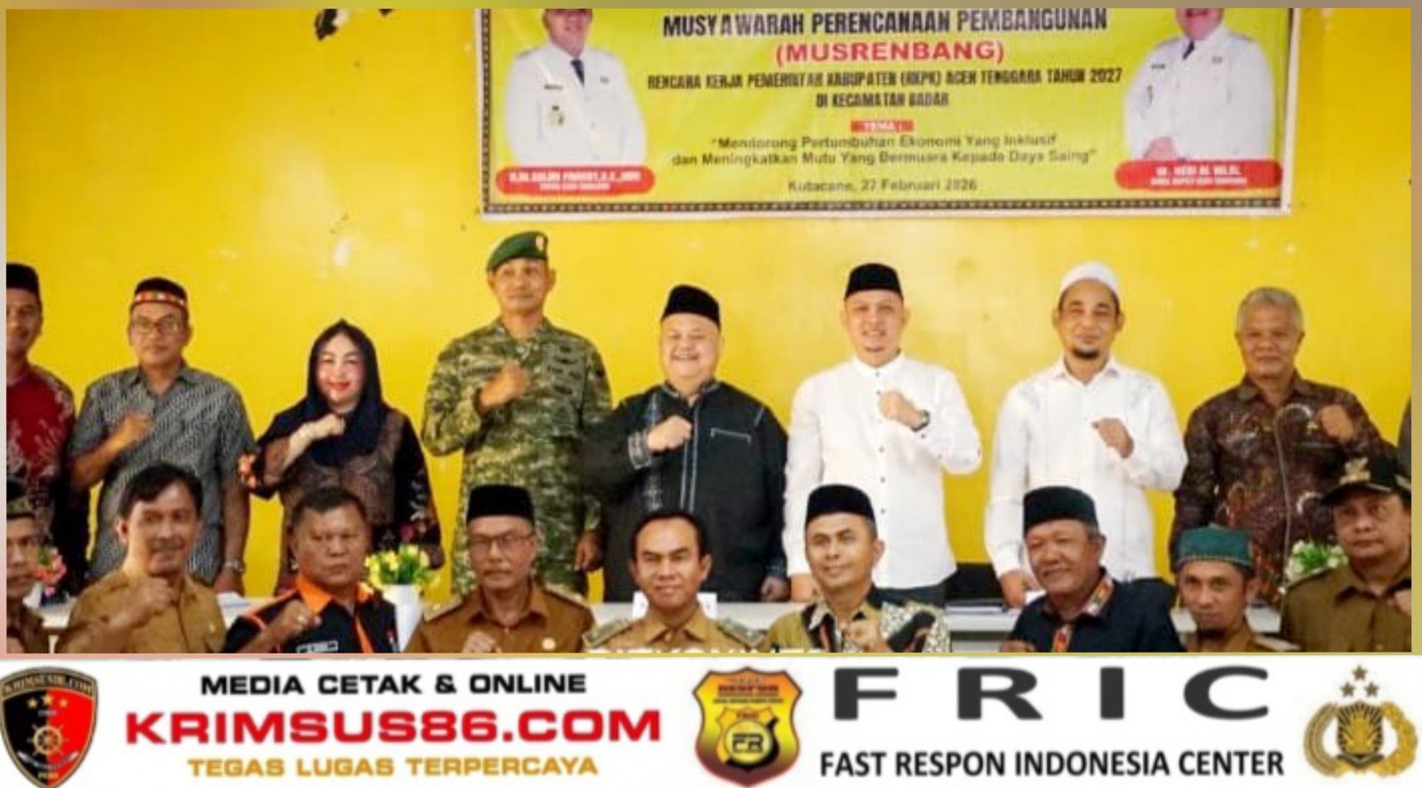 Krimsus86.com, Kutacane – Wakil Bupati Aceh Tenggara, Heri Al Hilal, menegaskan bahwa sektor infrastruktur menjadi prioritas utama dalam Musyawarah Perencanaan Pembangunan (Musrenbang) Rencana Kerja Pemerintah Kabupaten (RKPK) Tahun 2027 tingkat kecamatan yang digelar di Kecamatan Badar, Jumat (27/2/2026).