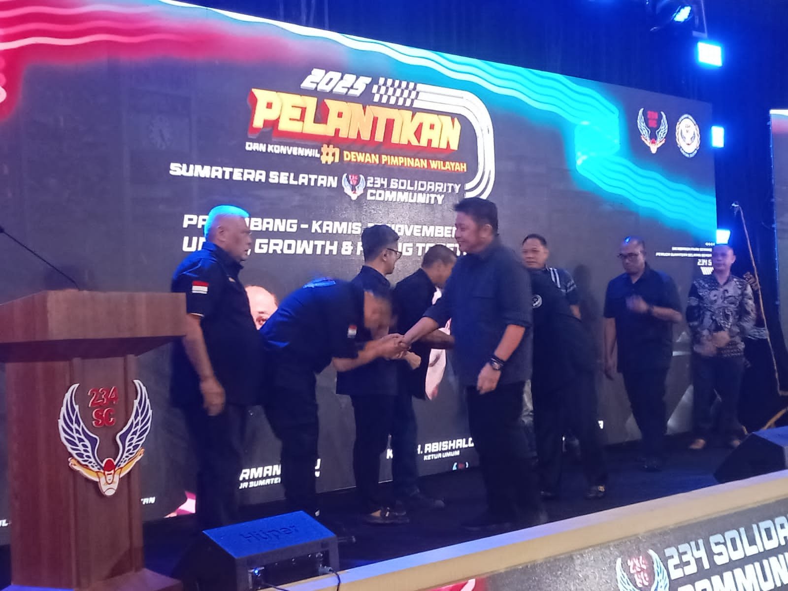 Krimsus86.com Palembang- 28-Nov-25 Pelantikan pengurus 234 Solidarity Community (SC) Provinsi Sumatera Selatan berlangsung khidmat di Lantai 3 Gedung DPRD Provinsi Sumsel, Kamis (27/11/2025). Hadir dalam kesempatan ini Ketua Umum 234 SC KRMH. Abishalom, S., Sekretaris Jenderal F. Royan Khalifa, Gubernur Sumsel H. Herman Deru, serta Ketua DPW 234 SC Provinsi Sumsel Charry Supriyanto.