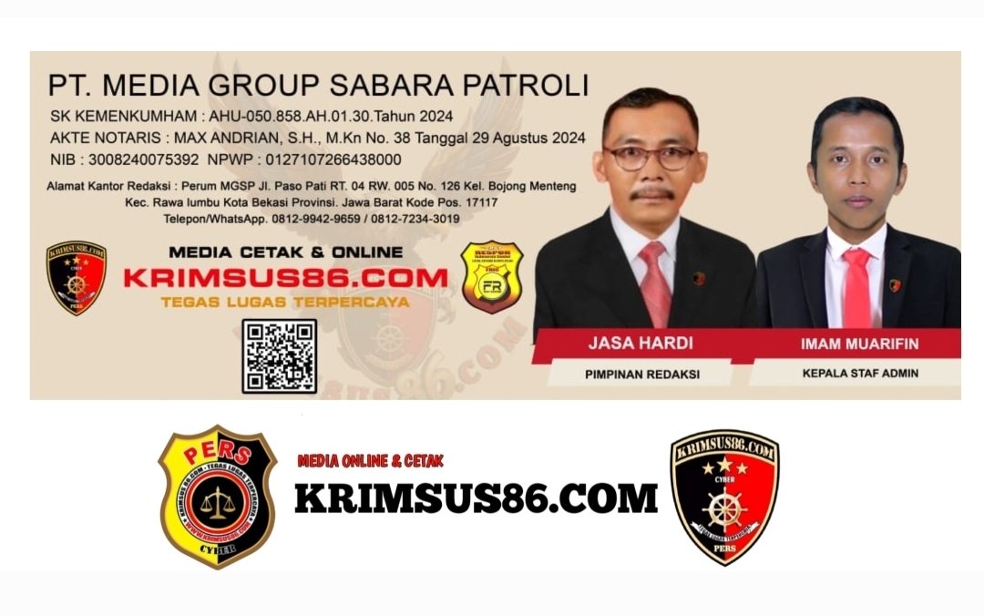 Jasahardi menegaskan bahwa Krimsus86.com merupakan media online dan cetak yang sah, legal, serta telah terverifikasi, berada di bawah naungan PT. MGSP (Media Group Sabara Patroli). Legalitas tersebut diperkuat dengan SK Kemenkumham Nomor AHU-050.858.AH.01.30 Tahun 2024, Akta Notaris MAX ADRIAN, S.H., M.Kn. Nomor 38 tertanggal 29 Agustus 2024, NIB: 3008240075392, serta NPWP: 01.271.072.6-643.8000.