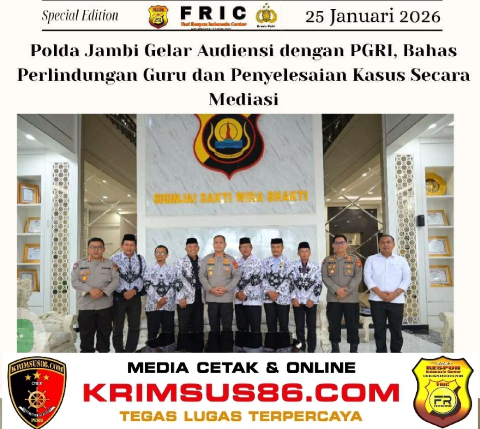KRIMSUS86.COM, Jambi – Polda Jambi menggelar audiensi bersama Pengurus Persatuan Guru Republik Indonesia (PGRI) Provinsi Jambi pada Senin (26/1/2026) di Ruang Coffee Morning Lantai 1 Gedung A Polda Jambi. Kegiatan ini dipimpin oleh Wakapolda Jambi Brigjen Pol. M. Mustaqim, S.I.K., dan dihadiri sejumlah pejabat utama Polda Jambi serta jajaran pengurus PGRI Provinsi dan kabupaten/kota.