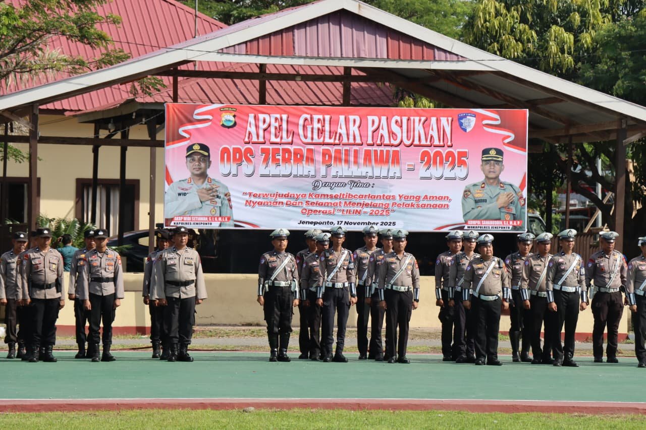 Krimsus86.com – JENEPONTO – Guna mewujudkan kamseltibcar lantas (keamanan, keselamatan, ketertiban, dan kelancaran lalu lintas) di Wilayah Hukum Polres Jeneponto, Kepolisian Resor Jeneponto menggelar Apel Gelar Pasukan Operasi Zebra Pallawa – 2025, pada Senin (17/11/2025) pagi.