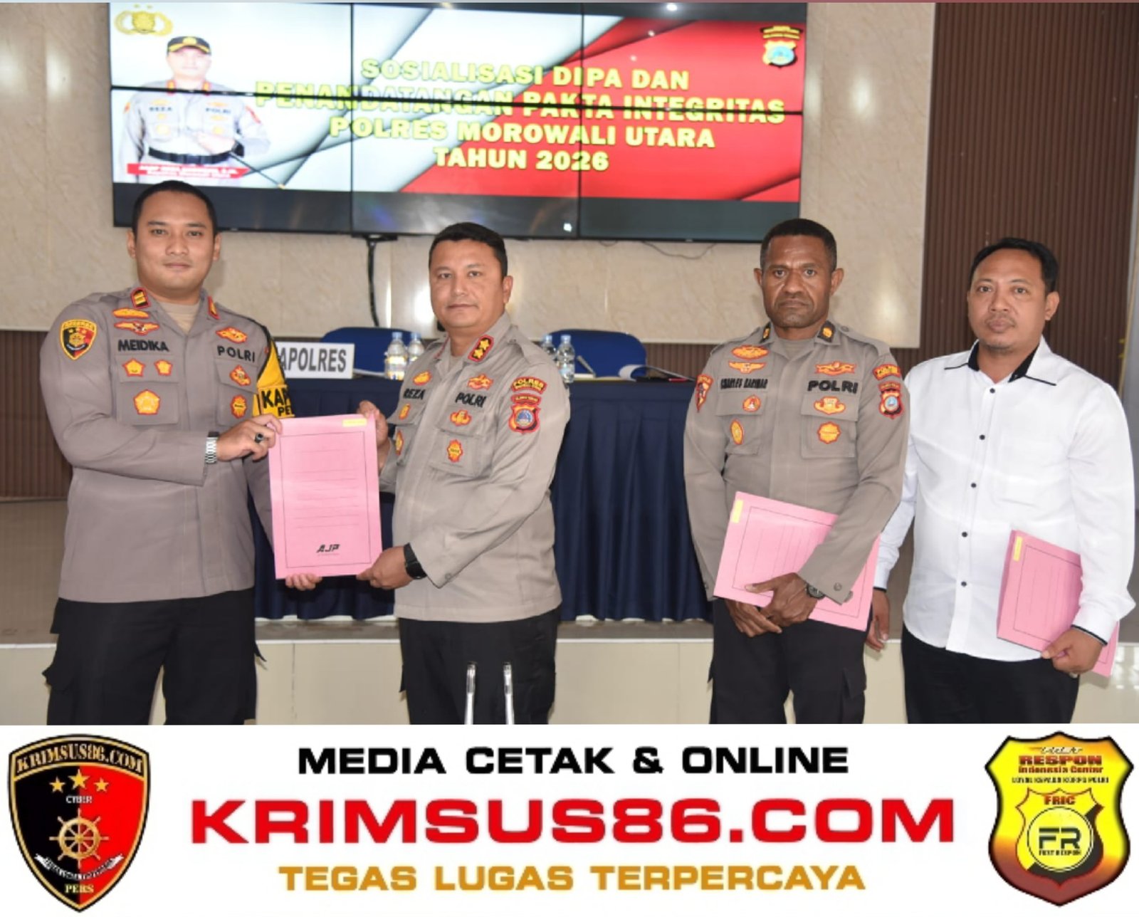 Krimsus86.com, Morowali Utara — Kepolisian Resor Morowali Utara menggelar kegiatan Sosialisasi Daftar Isian Pelaksanaan Anggaran (DIPA) / RKA-KL Tahun Anggaran 2026 yang dirangkaikan dengan Penandatanganan Pakta Integritas, Senin (26/1/2026).