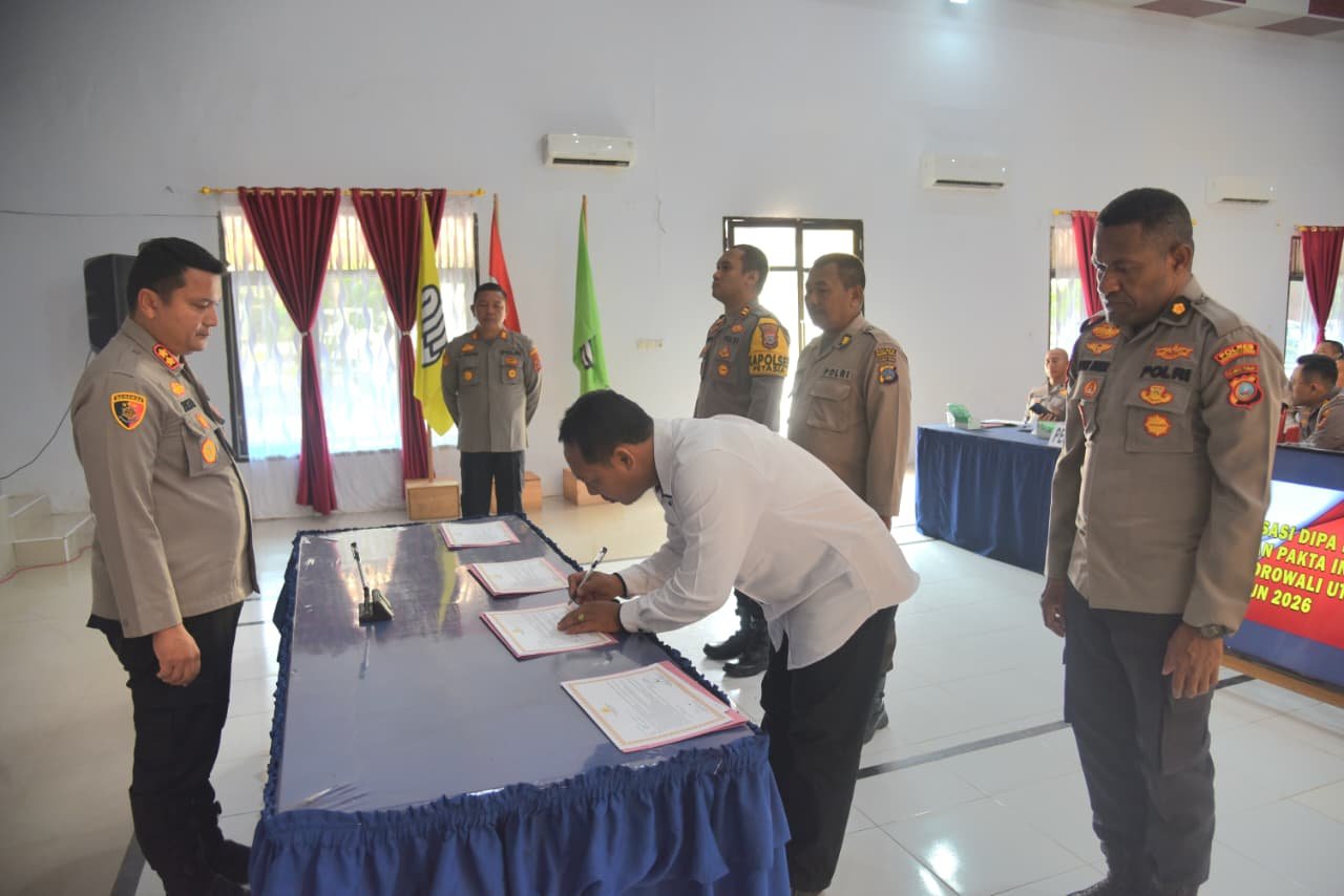 Sebagai bentuk komitmen nyata, kegiatan diakhiri dengan penandatanganan Pakta Integritas Tahun Anggaran 2026 oleh para Kepala Bagian (Kabag), Kepala Satuan (Kasat), Kapolsek, serta Kapolsubsektor jajaran Polres Morowali Utara.