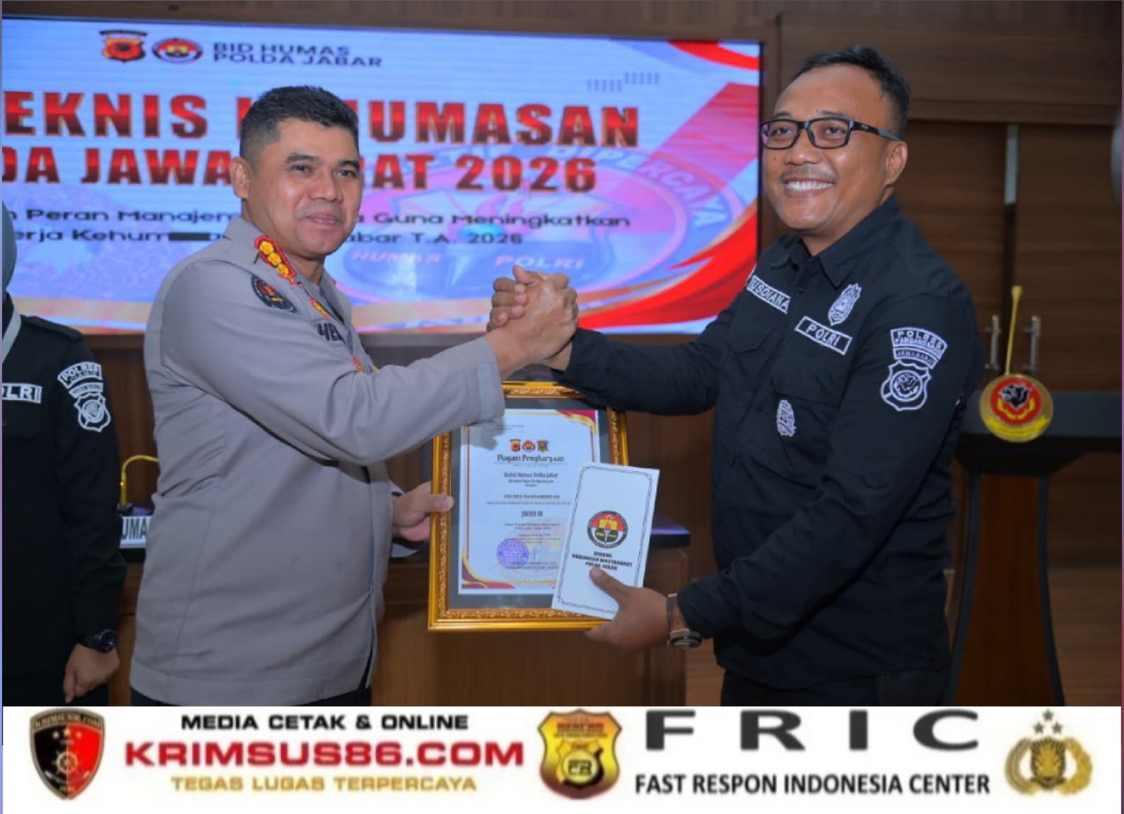 Krimsus86.com Pangandaran, 13 Februari 2026 – Prestasi membanggakan kembali ditorehkan oleh Polres Pangandaran dengan meraih Juara 3 dalam kategori Amplifikasi Pemberitaan Media Online tingkat Polda Jawa Barat. Penghargaan ini diberikan dalam rangkaian kegiatan Bimbingan Teknis (Bimtek) Kehumasan yang digelar oleh Bidang Humas Polda Jabar, Kamis (12/2/2026).