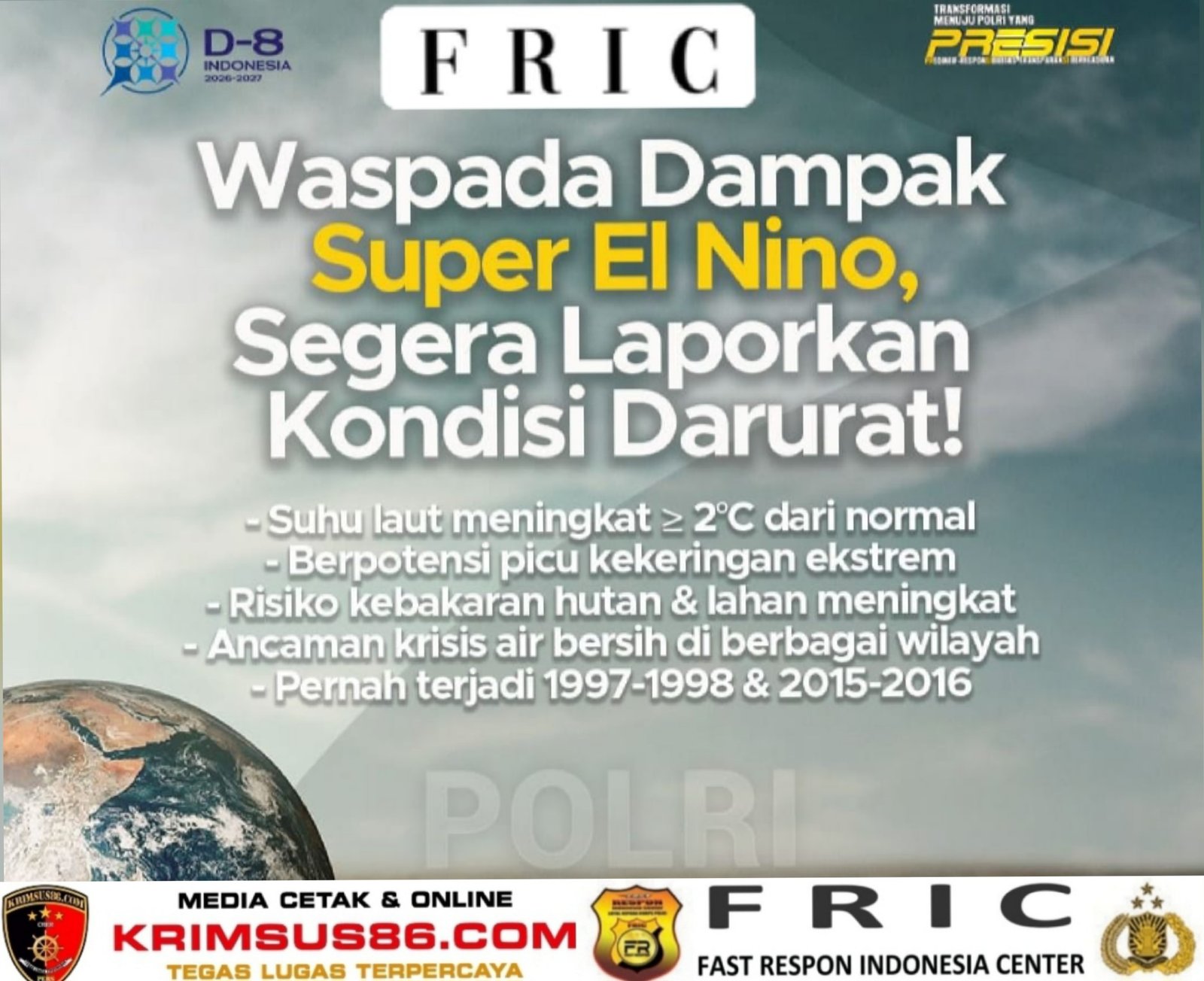 Dengan langkah antisipatif yang terukur serta dukungan seluruh elemen masyarakat, Polri optimistis dampak fenomena Super El Niño dapat diminimalisir, sehingga stabilitas keamanan, keselamatan masyarakat, dan kelestarian lingkungan tetap terjaga.