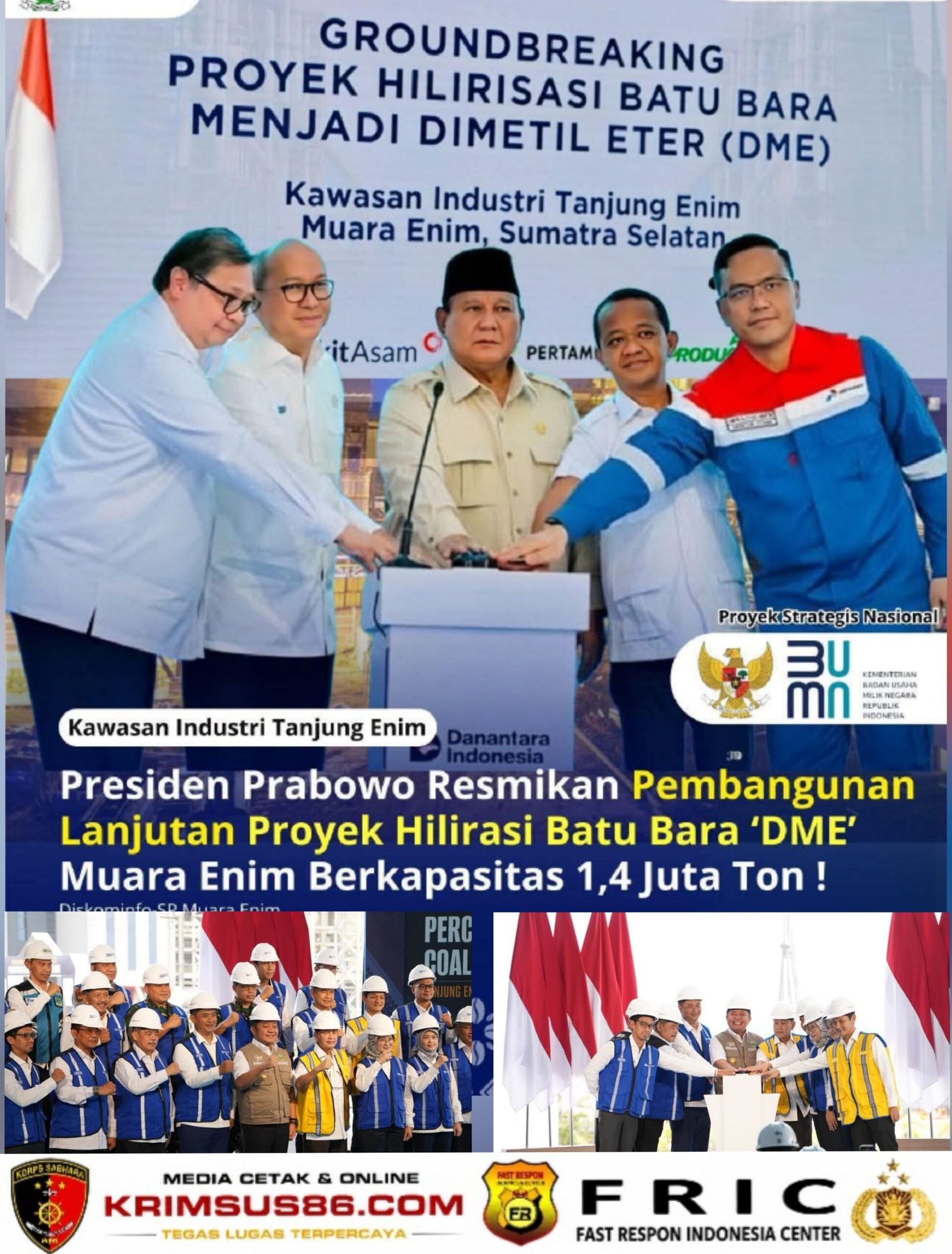 Krimsus86.com Muara Enim  30 April 2026 – Presiden Republik Indonesia, Prabowo Subianto, secara resmi meresmikan peletakan batu pertama (groundbreaking) Hilirisasi Nasional Fase 2 untuk percepatan proyek Coal to Dimethyl Ether (DME) di Tanjung Lalang, Kecamatan Tanjung Agung, Kabupaten Muara Enim, Sumatera Selatan, Rabu (29/04/2026). Peresmian dilakukan secara virtual dan dipusatkan di PLTU Sumsel-8 milik PT Huadian Bukit Asam Power.