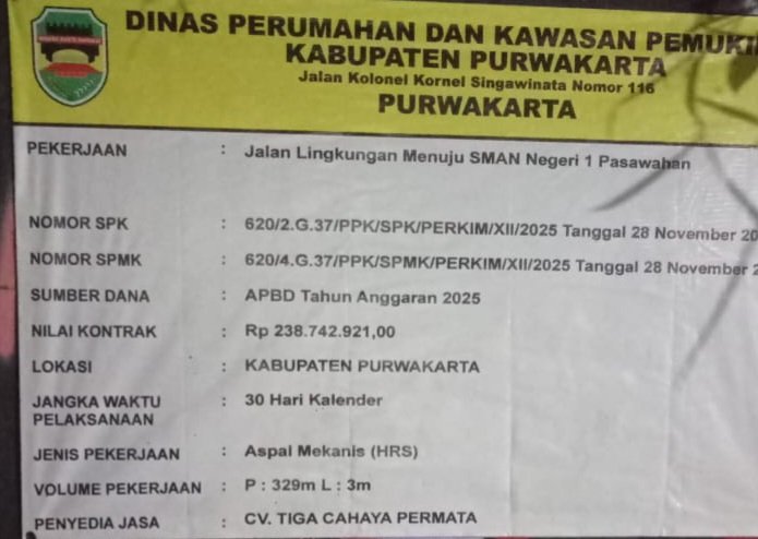 Kegiatan pengaspalan jalan tersebut bersumber dari Anggaran Pendapatan dan Belanja Daerah (APBD) Kabupaten Purwakarta Tahun Anggaran 2025, dengan pagu anggaran sebesar Rp238.742.921,00.