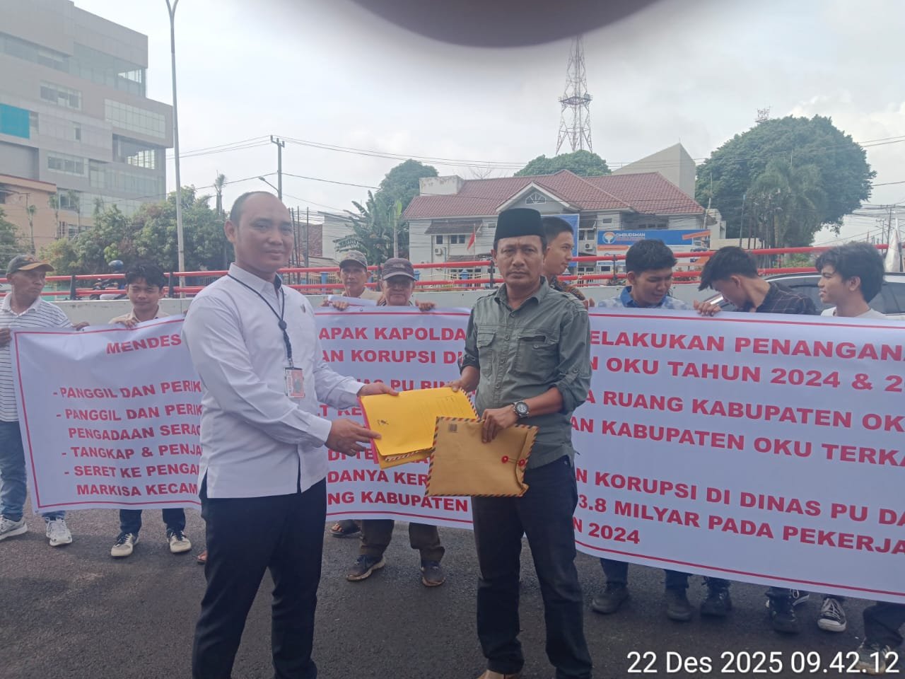 Sriwijaya Corruption Watch (SCW) Koordinator Wilayah Kabupaten Ogan Komering Ulu (OKU) menggelar aksi unjuk rasa di Markas Kepolisian Daerah Sumatera Selatan (Polda Sumsel), Senin (22/12/2025). Aksi tersebut dilakukan untuk melaporkan sejumlah dugaan tindak pidana korupsi yang diduga terjadi di lingkungan Pemerintah Kabupaten OKU, khususnya pada Dinas Pekerjaan Umum Bina Marga dan Dinas Pendidikan.