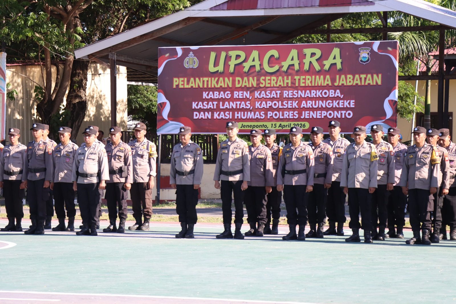Jeneponto – Kepolisian Resor (Polres) Jeneponto melaksanakan upacara pelantikan dan serah terima jabatan (sertijab) sejumlah Pejabat Utama di halaman Mapolres Jeneponto, Rabu (15/4/2026). Kegiatan berlangsung khidmat dan diikuti oleh jajaran pejabat utama serta seluruh personel Polres Jeneponto.