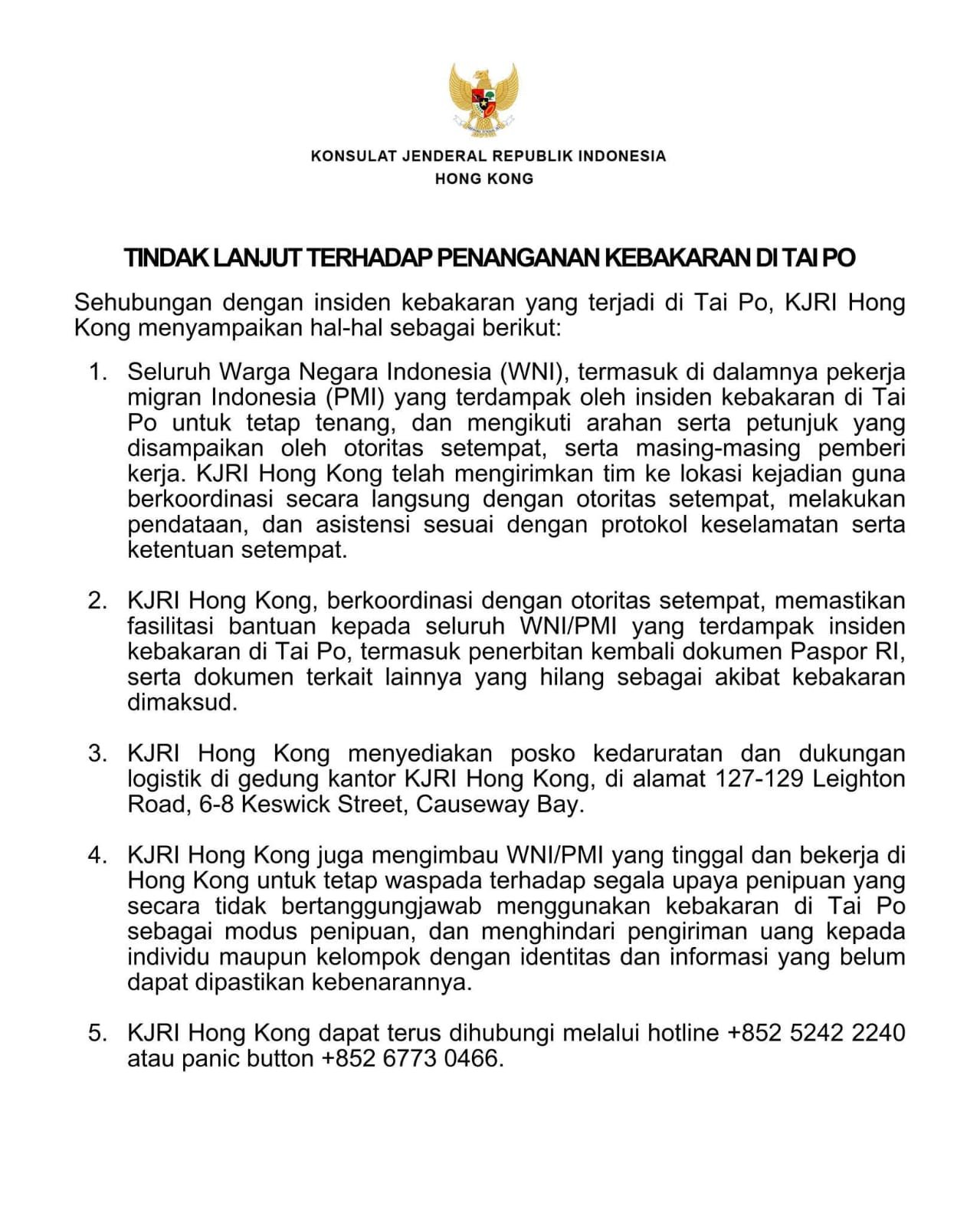 KJRI Hong Kong memastikan bahwa seluruh Warga Negara Indonesia (WNI), termasuk Pekerja Migran Indonesia (PMI) yang terdampak insiden kebakaran, berada dalam kondisi yang aman. KJRI mengimbau seluruh WNI/PMI untuk tetap tenang serta mengikuti arahan dan instruksi dari otoritas setempat dan pihak pemberi kerja.
