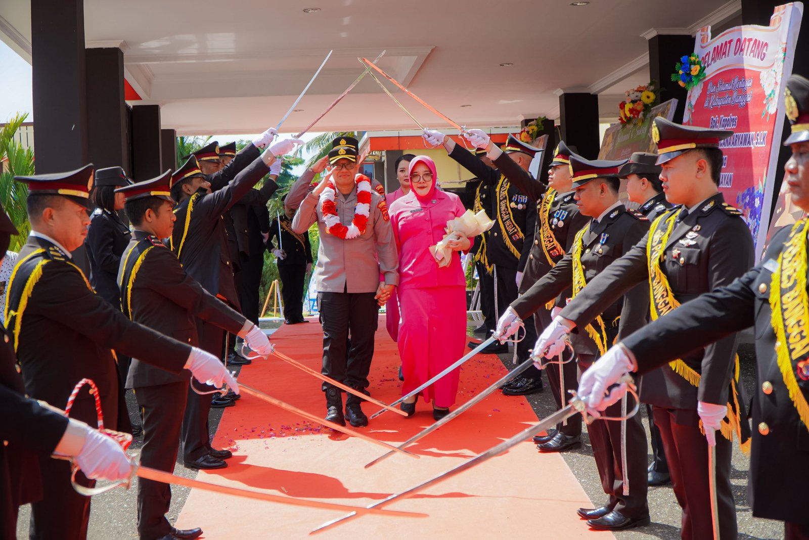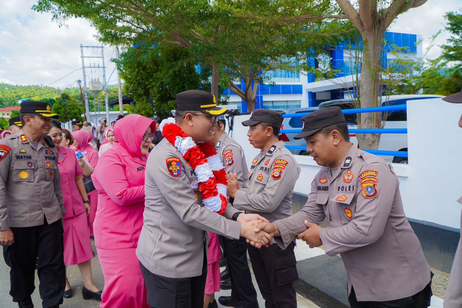 Penyambutan tersebut turut dihadiri Kapolres Banggai lama AKBP Putu Hendra Binangkari, SIK, didampingi Ny. Ika Putu, Wakapolres Banggai Kompol Frangky Jefry Rey, para Pejabat Utama Polres Banggai, para Kapolsek jajaran, serta pengurus Bhayangkari.