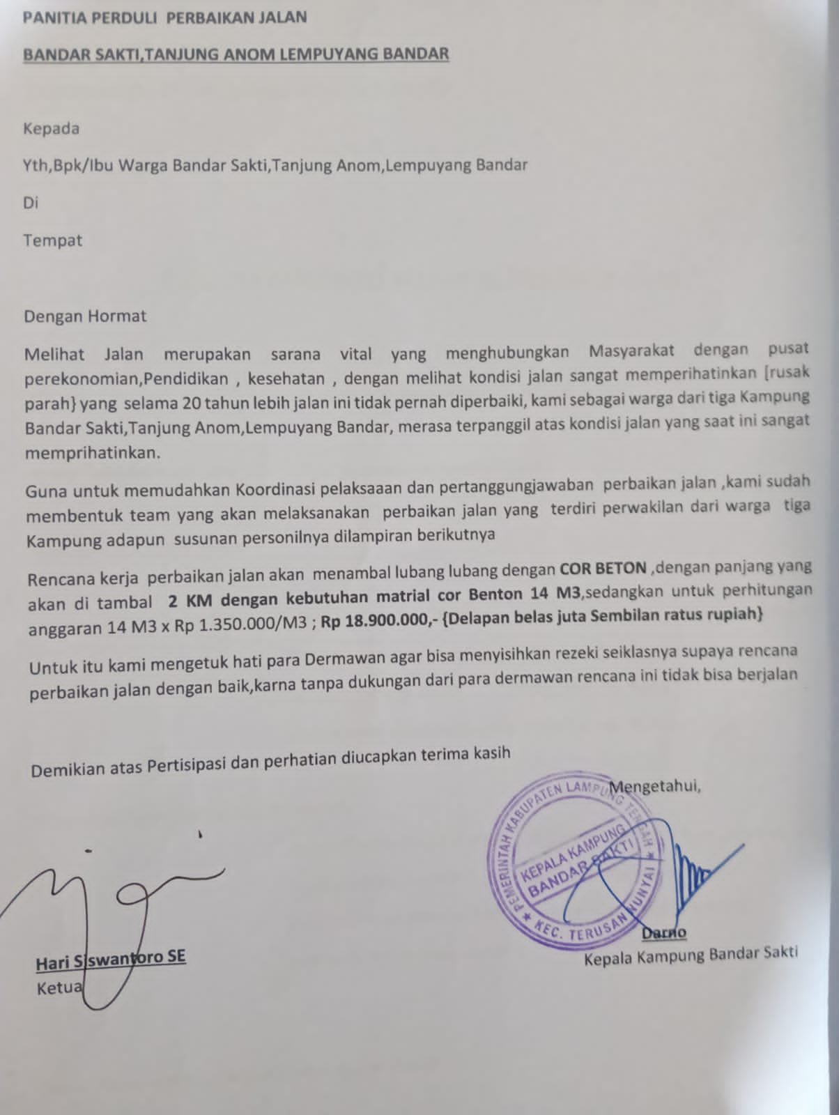 Kegiatan perbaikan jalan ini dilaksanakan secara swadaya oleh masyarakat setempat, dengan persetujuan dan dukungan penuh dari Kepala Kampung Bandar Sakti, Bapak Darmo. Panitia pembangunan menggalang sumbangan sukarela dari warga tiga kampung sebagai bentuk kepedulian bersama terhadap infrastruktur jalan yang telah lebih dari 20 tahun tidak tersentuh perbaikan.